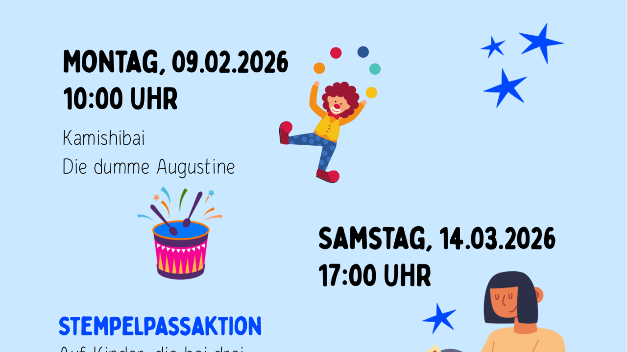 Am Montag, 09.02 findet die nächste Lesung mit Henriette um 10:00 Uhr bei uns in der Bücherei statt. Gelesen wird das Kamishibai: die dumme Augustine. Wir freuen uns auf alle, die mit dabei sind!